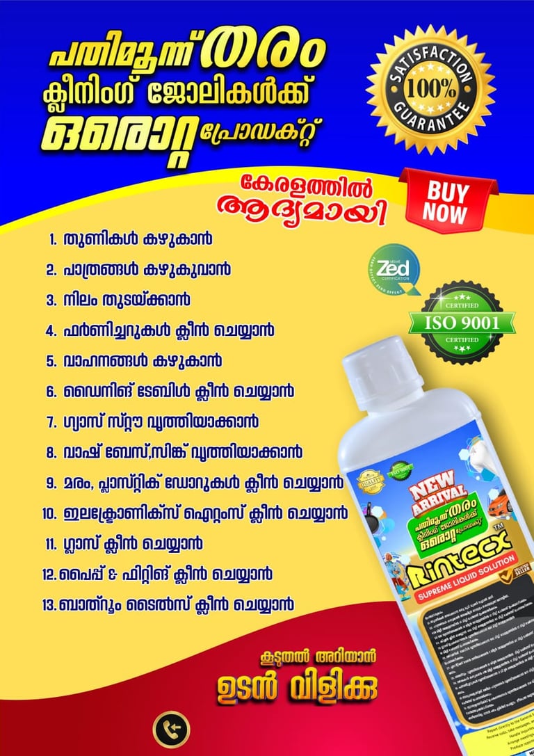 സമ്പൂർണ്ണ ശുചിത്വത്തിനും പ്രകൃതി സംരക്ഷണത്തിനുമായി രൂപകൽപ്പന ചെയ്ത നവീന ക്ലീനിംഗ് സൊല്യൂഷനാണ് റിന്റെക്സ് – സുപ്രീം ലിക്വിഡ് സൊല്യൂഷൻ.